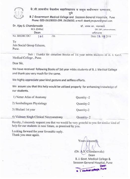 Educon team visited Dr. Chandwale Sir’s office on 6th Feb and within 10 days we delivered all the required medical books to them inspite of Educon not having enough funds. The students were totally stress free and highly motivated. They all passed their first year in first class and committed to focus on their studies.