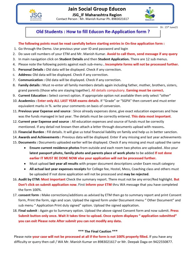 All old Educon students who had filled on line application in previous years and require financial support this year also, must read each word of these instructions before filling the on line Re-application. If any query send WA message to Mr Manish Kumar on 8983021617. He will revert back to you