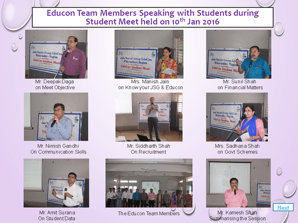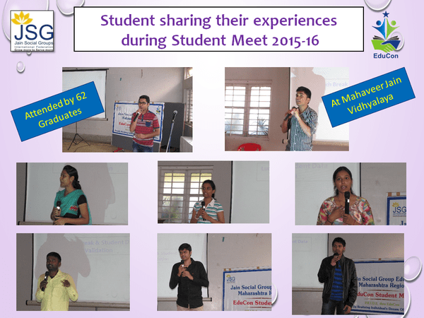 Student Meet 2016, was held at Pune exclusively for Educon students pursuing graduation in different disciplines like CA, CS, Engg, IT, Medical, Para Medical, Commerce, Fine arts, Nursing etc. Educon Team members guided the students on various topics of their interest. Student to Student connect concept was explained and implemented in totality, which was a very useful outcome of the meet.